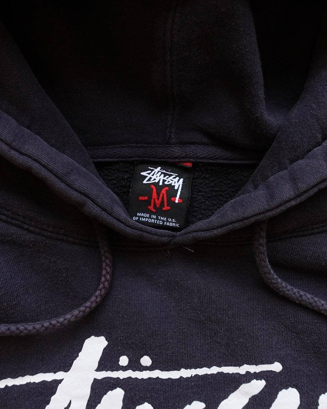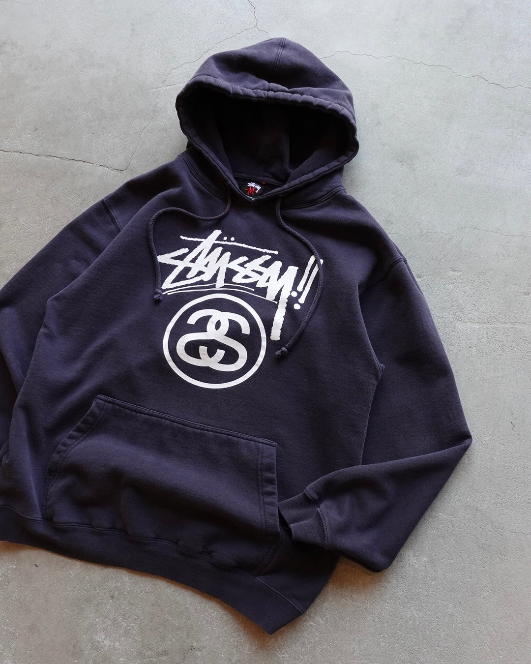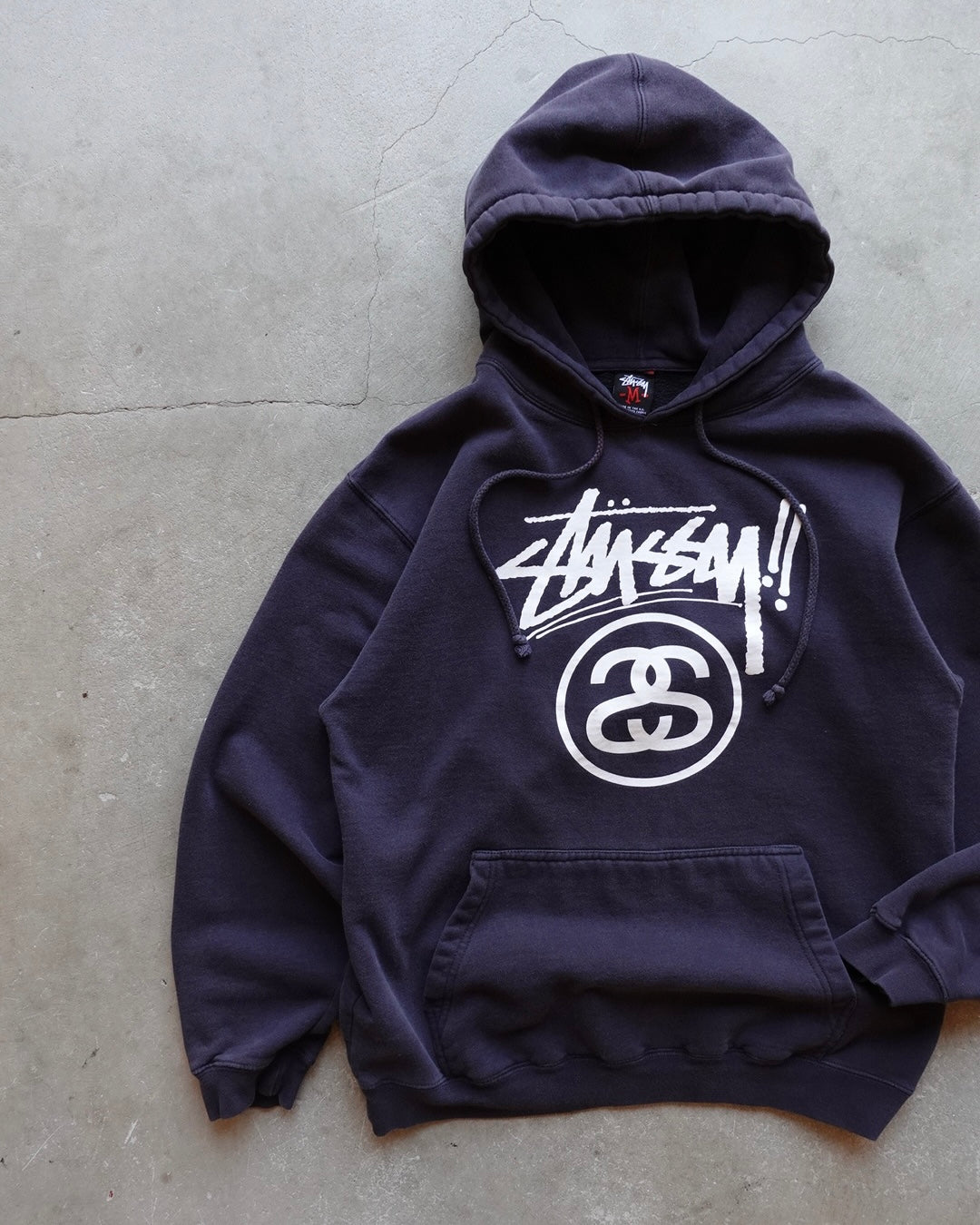 90〜00年代のStussy、USA製のパーカー。長年の着用によるフェードが全体に山れ、新品では出せない独特の色落ちを生み出しています。ストリートカルチャーのアイコンとしての地位を確立した時代の一枚。
