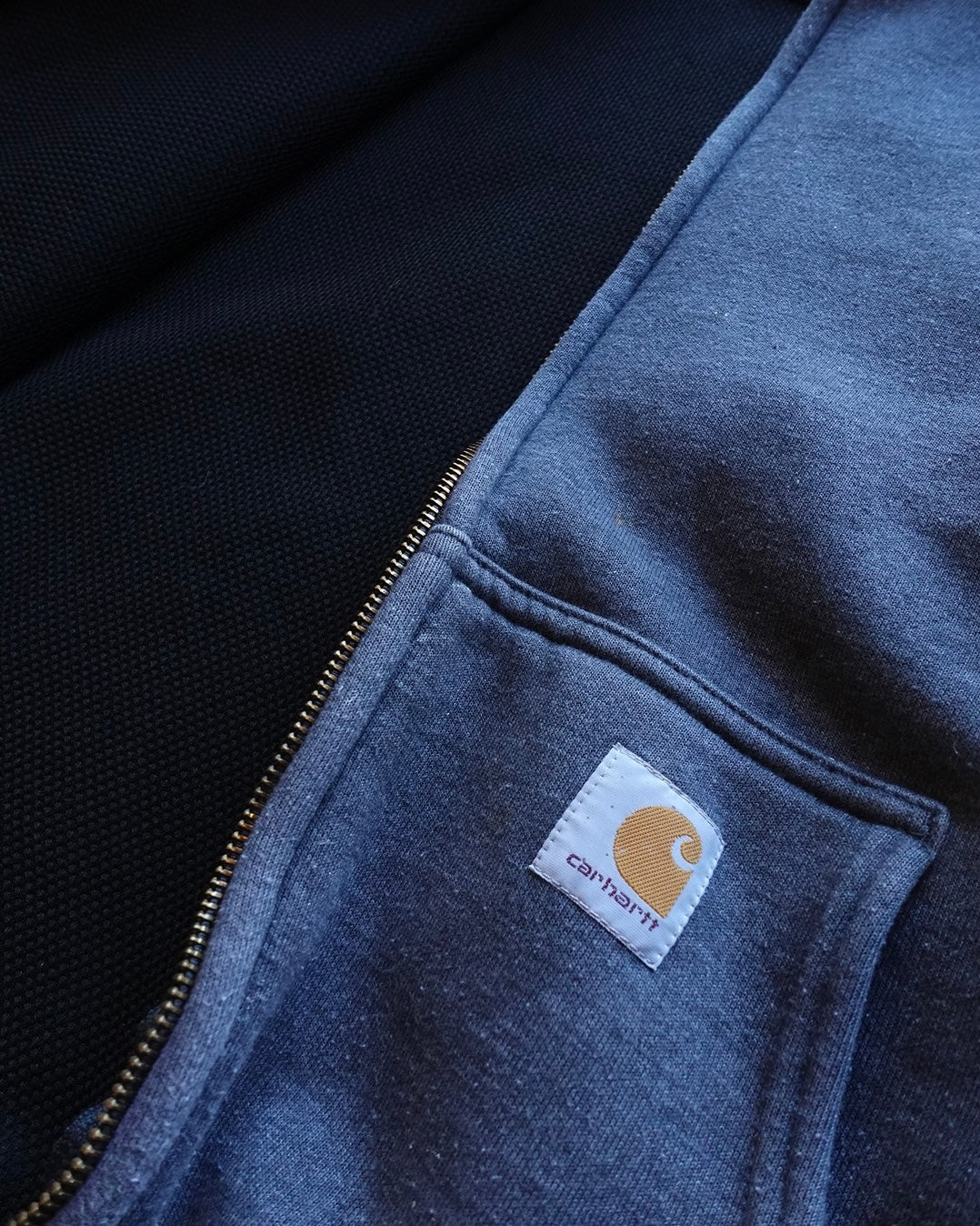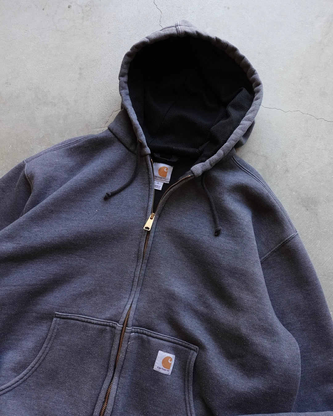 Carharttのジップフーディ、裏地付き仕様。ダークグレーのボディに裏地を備えた肉厚仕様は、寄る寛さと保温性が段違い。ワークウェアとしての実用性を極めた一枚で、寒い季節のアウターとしても十分な存在感。